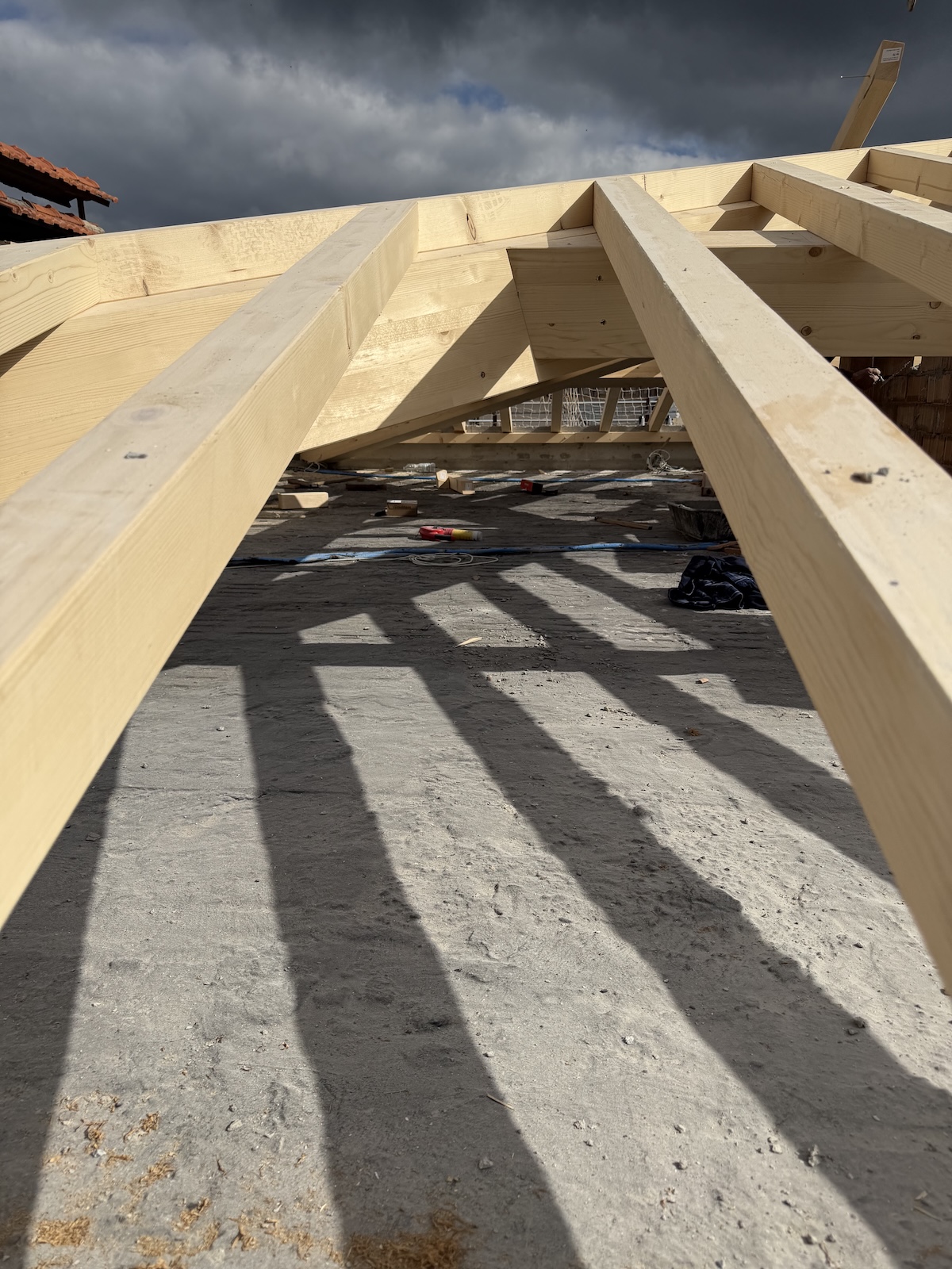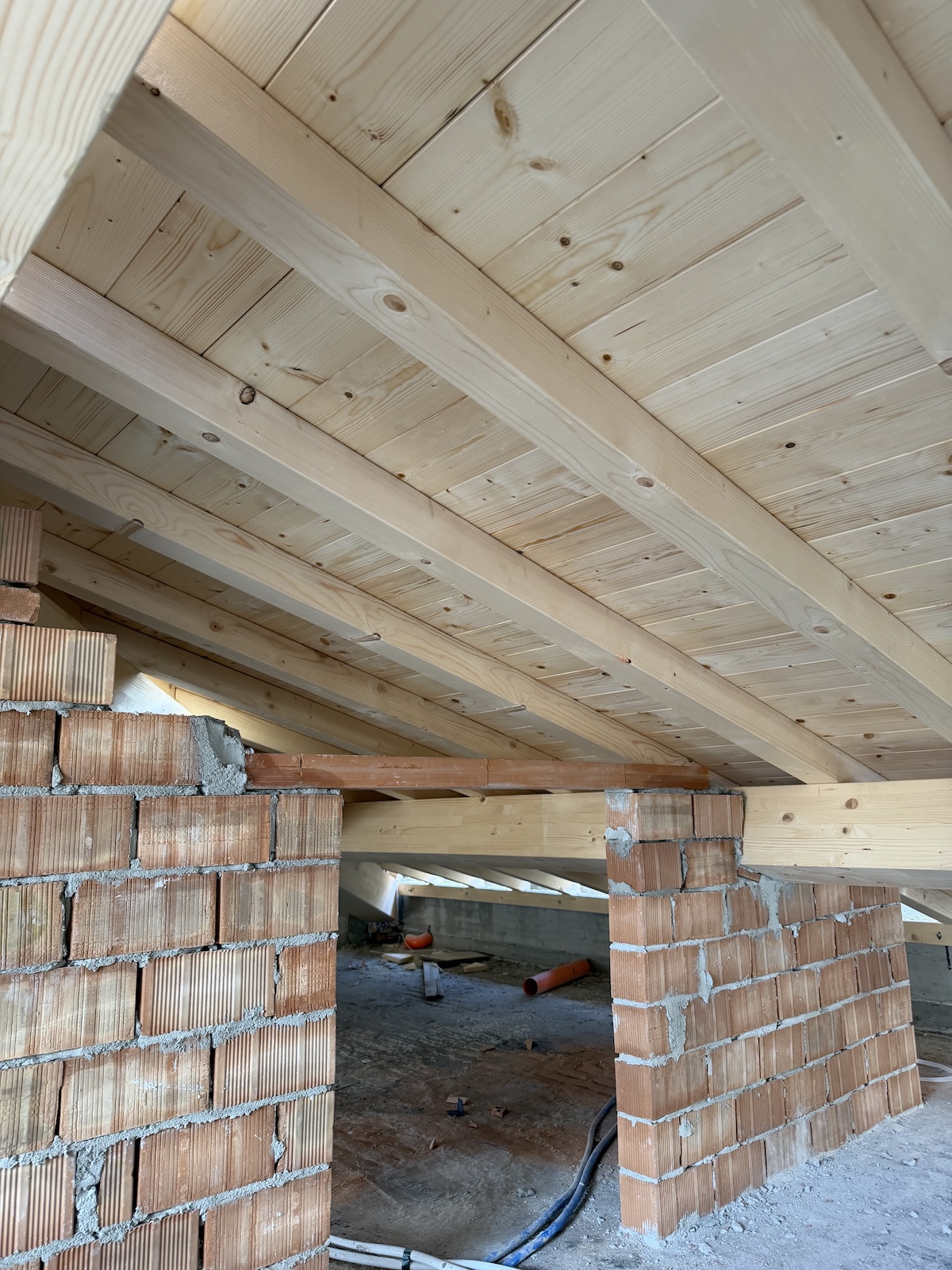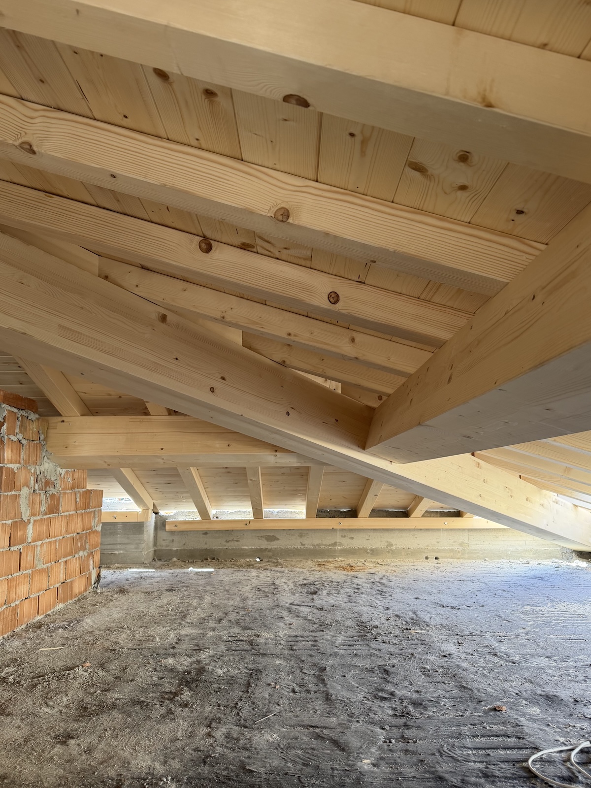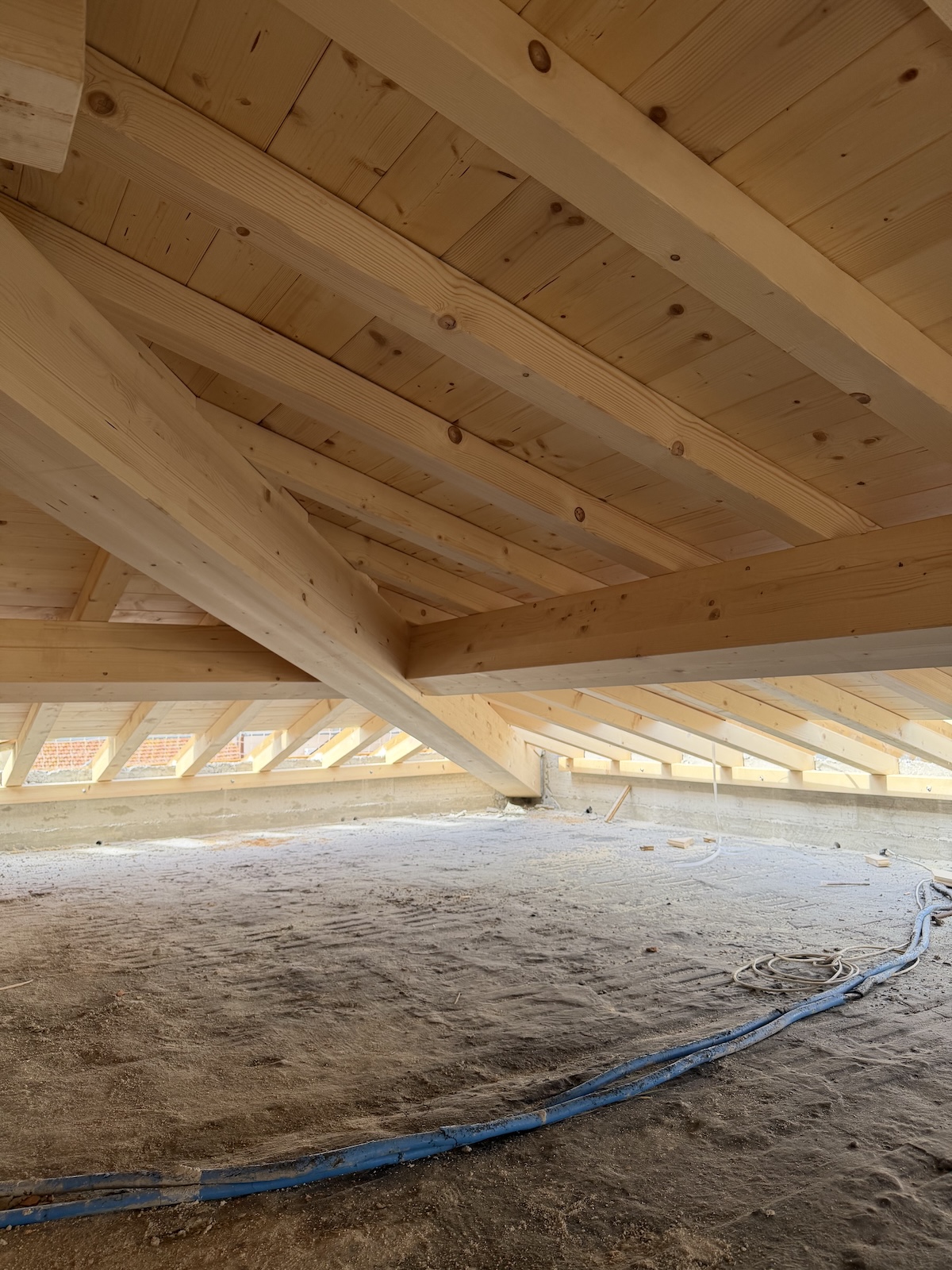 Per l’orditura secondaria interna abbiamo invece utilizzato travetti in abete massiccio, mentre i travetti in aggetto di gronda sono stati realizzati in legno lamellare per assicurare continuità strutturale e maggiore durabilità.
