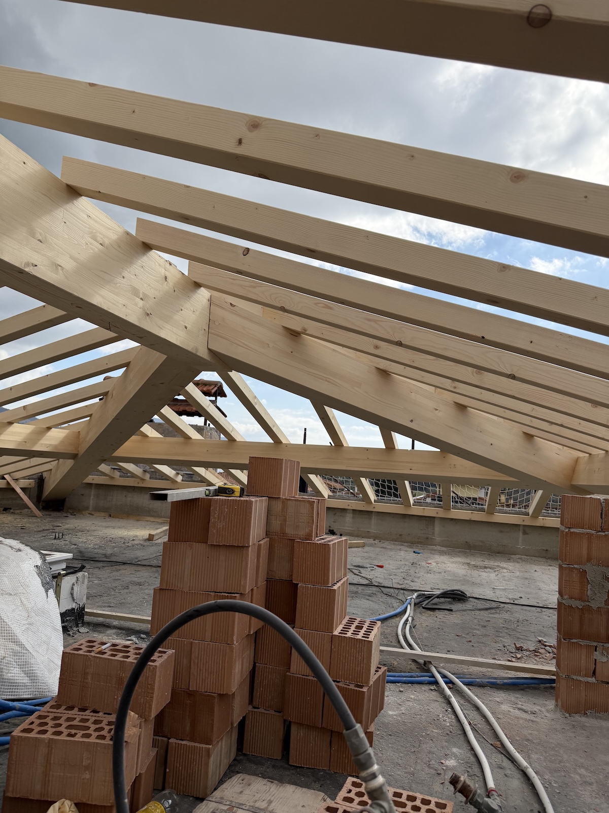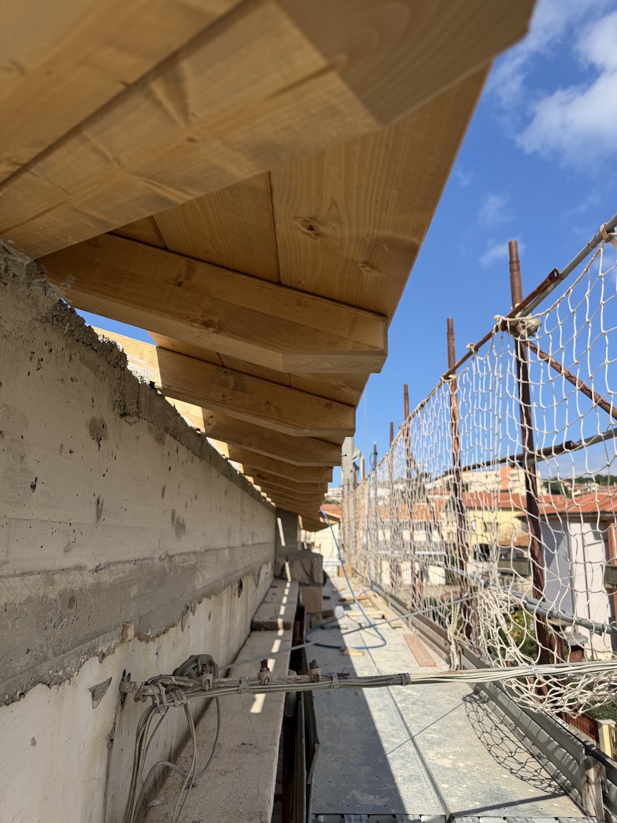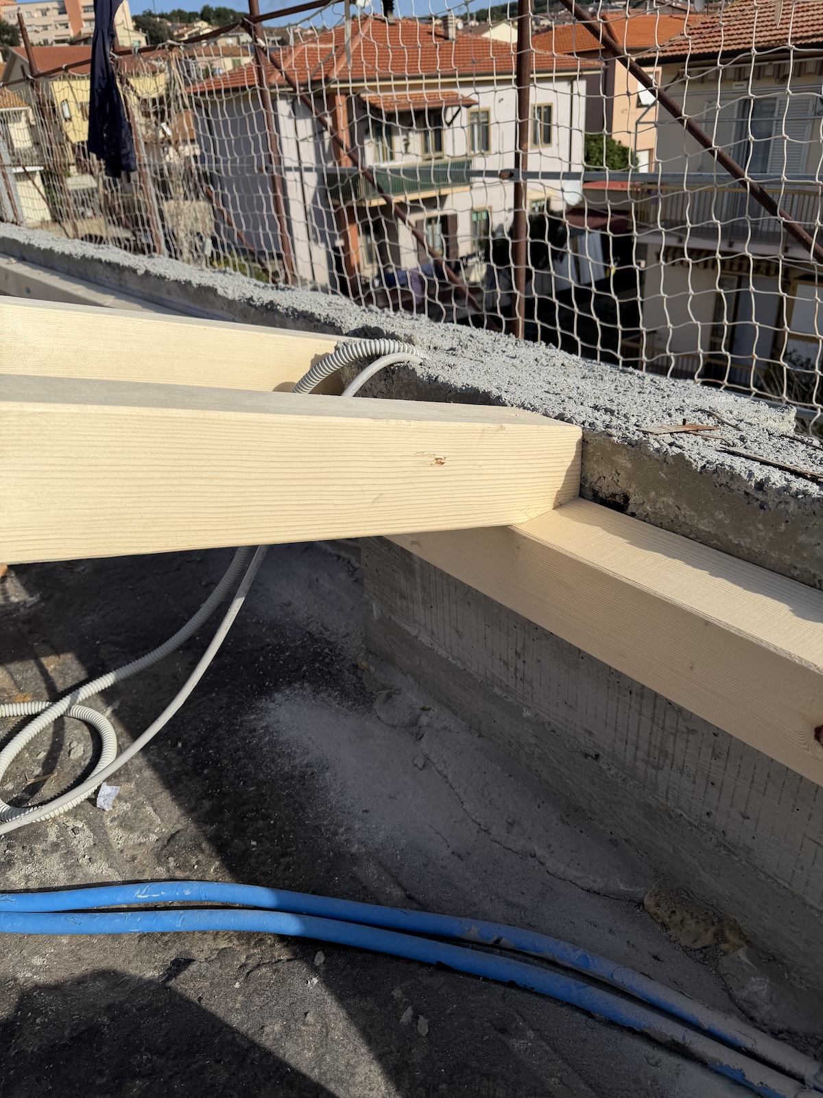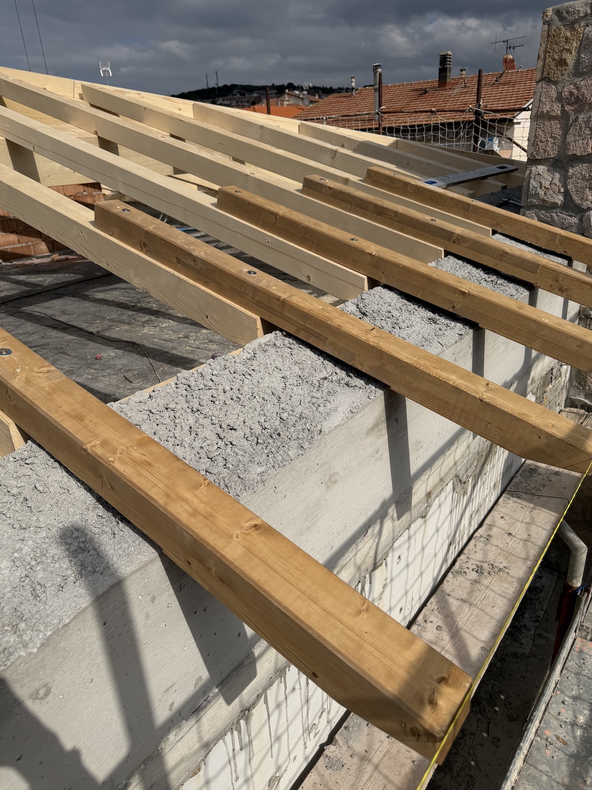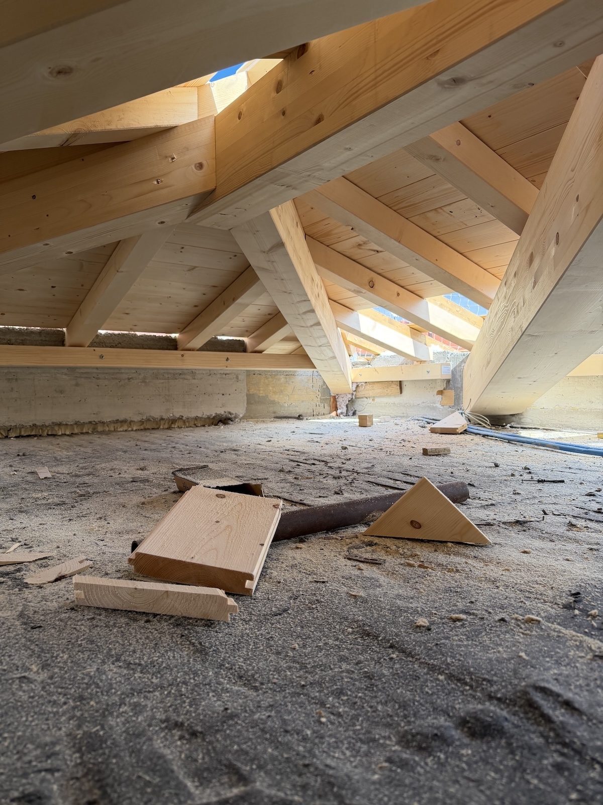 Per l’orditura secondaria interna abbiamo invece utilizzato travetti in abete massiccio, mentre i travetti in aggetto di gronda sono stati realizzati in legno lamellare per assicurare continuità strutturale e maggiore durabilità.